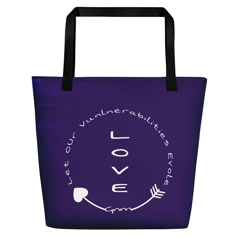 Love - Let Our - Vulnerabilities Evolve - Beach Bag. A trendy beach bag, where you can put everything that matters when hitting those warm beaches. • 100% polyester fabric • Maximum weight limit – 44lbs (20kg) • Large inside pocket • Comfortable cotton webbing handles • Vibrant colors that won't fade • Available in one size All Inspirational Designs done in collaboration With GNM and Will's Mighty Design.