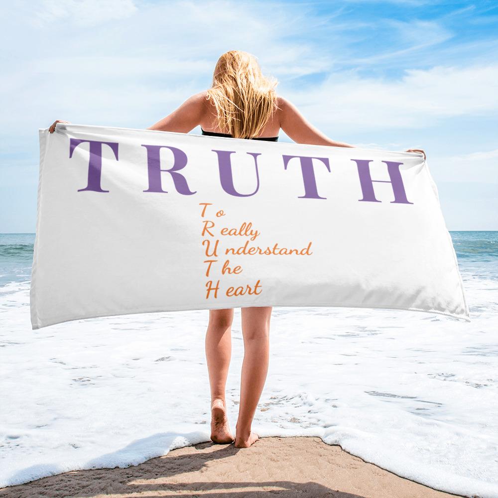 Truth - Inspirationals Towel. Give your bathroom a vibrant look and wrap yourself up with this super soft and cozy all-over sublimation towel. • Available in one size: 30”x60” • 52% cotton, 48% polyester • Made in China. Printed in the USA • Printed on one side only • The non-printed side is made of terry fabric, making the towel more water-absorbent All Inspirational Designs done in collaboration With GNM and Will's Mighty Design.