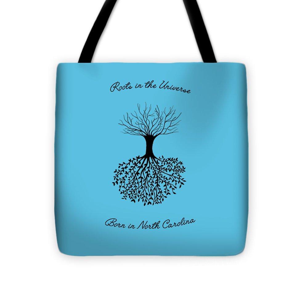 Born in North Carolina -Roots In The Universe -Tote Bag. Our tote bags are made from soft, durable, poly-poplin fabric and include a 1" black strap for easy carrying on your shoulder. All seams are double-stitched for added durability. Each tote bag is machine-washable in cold water and is printed on both sides using the same image. All Inspirational Designs done in collaboration With GNM and Will's Mighty Design.